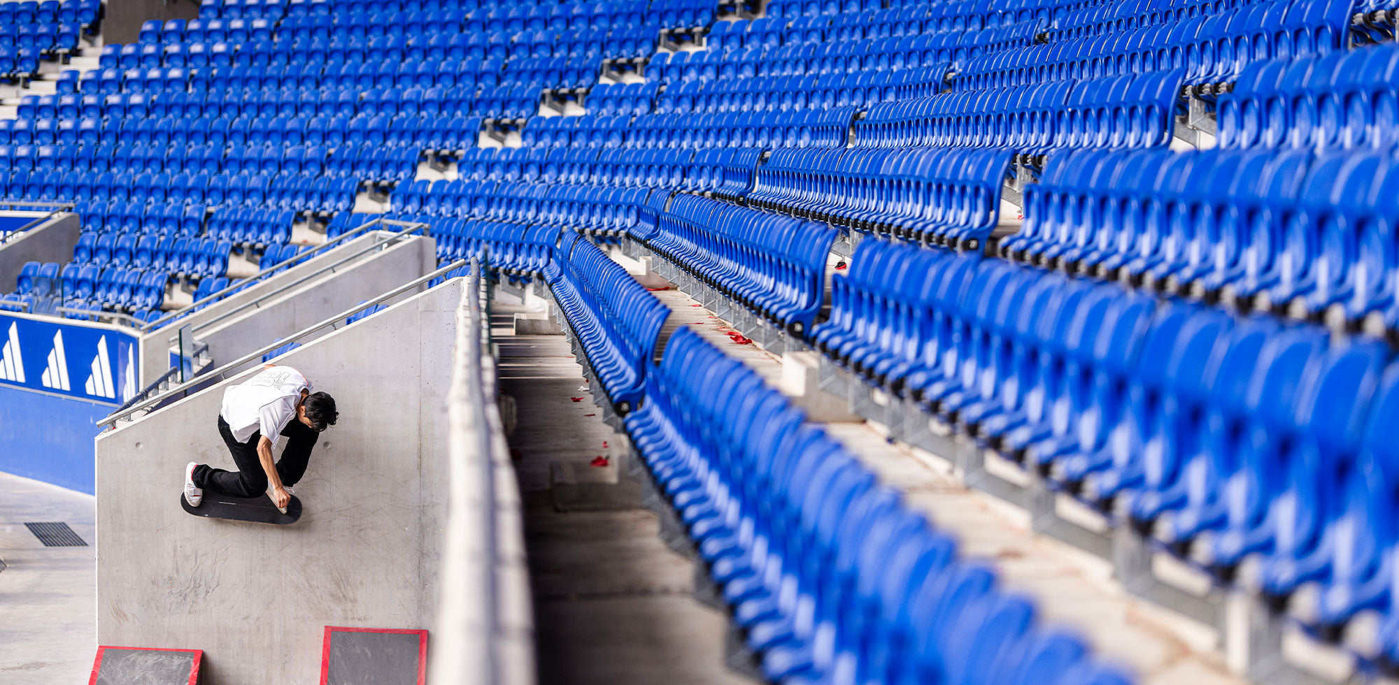 To bring this collection to life, adidas produced a campaign film featuring four team riders – Jenn Soto, Shin Sanbongi, Tim Debauche, and Miles Silvas – sneaking into the Groupama Stadium for a clandestine session. Between tricks on the concrete, chases with security, and tongue-in-cheek humor, the video perfectly captures the essence of skateboarding: free, bold, and irreverent. This visual narrative echoes a simple truth: Lyon has always been an open-air playground where skateboarding and football coexist.
